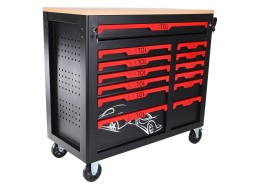 MECHANIC TROLLEY TITAN 1559 es un robusto carro de taller diseñado para profesionales exigentes que requieren la máxima visibilidad, organización y acceso inmediato a todo tipo de herramientas. Cuerpo de chapa de acero SPCC de 0,8 mm de espesor, 13 cajones independientes con deslizamiento suave, cierre central y tablero de trabajo de MDF constituyen la base ideal para el uso diario en talleres de automóviles, instalaciones de producción y talleres domésticos. El carro está equipado con un total de 1559 piezas de herramientas de calidad almacenadas en organizadores de espuma EVA: desde vasos, puntas, carracas y llave dinamométrica hasta alicates, martillos, llaves combinadas, llaves en T o puntas especiales extendidas hasta 300 mm. Las grandes ruedas de 5" permiten un fácil desplazamiento incluso con carga completa y el freno en dos ruedas garantiza la estabilidad durante el trabajo. TITAN 1559 es una solución profesional completa que prepara su puesto de trabajo al instante para cualquier tarea.