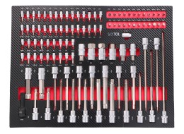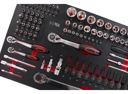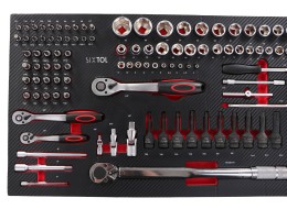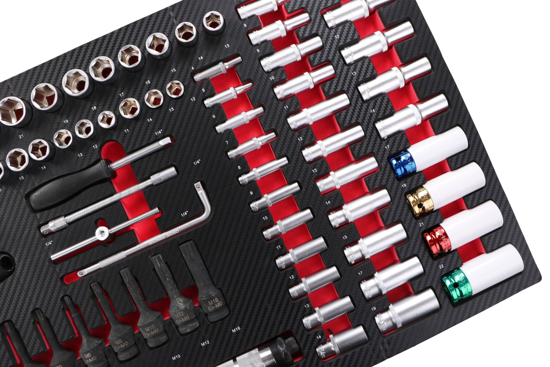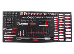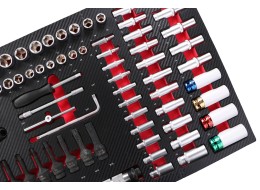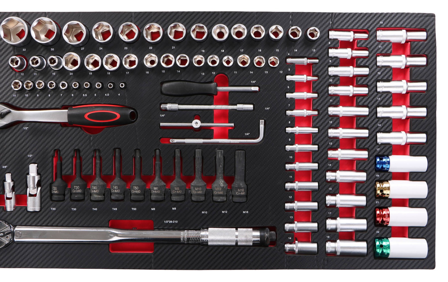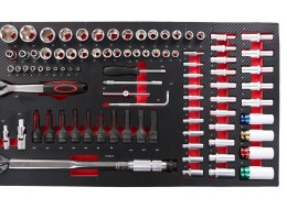 Contenido del carro:- 1. Cajón – 136x vasos, puntas, carracas, prolongadores y llave dinamométrica