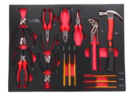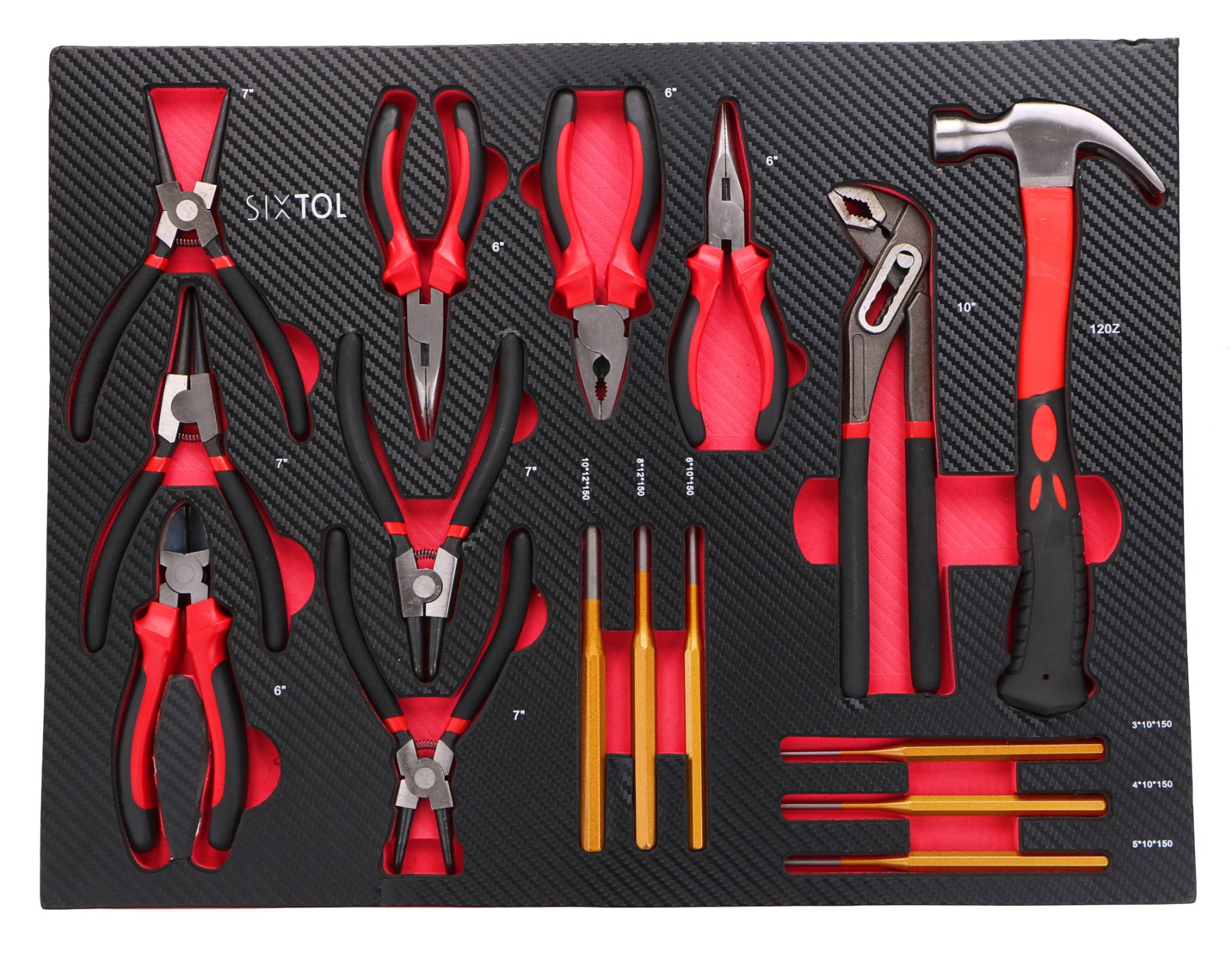- 1x Llave dinamométrica 1/2": Rango: 28–210 N·m- 2. Cajón – 16x alicates y otras herramientas
