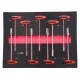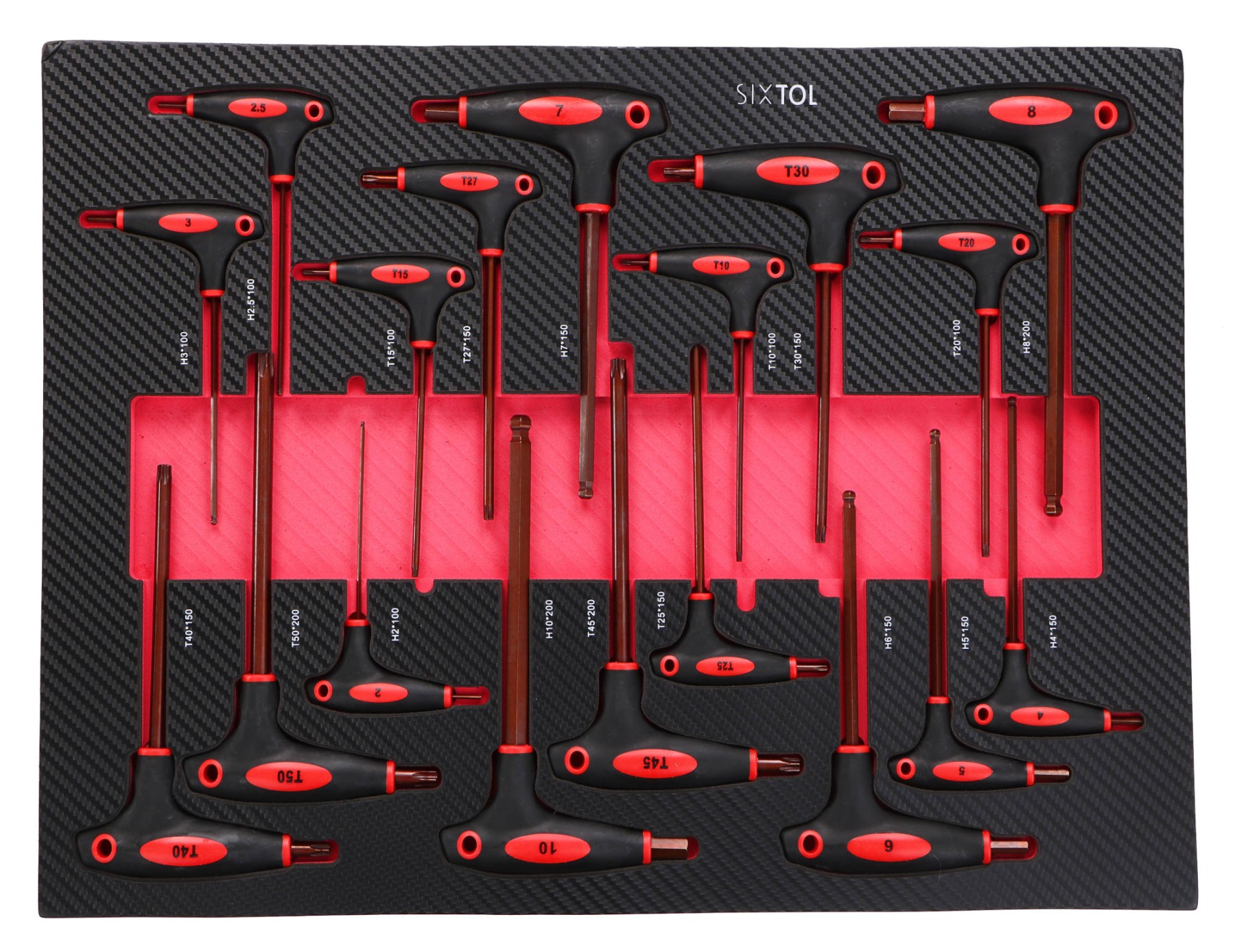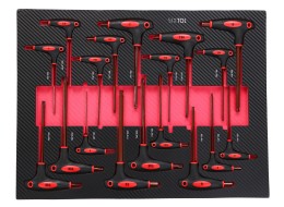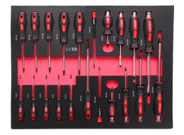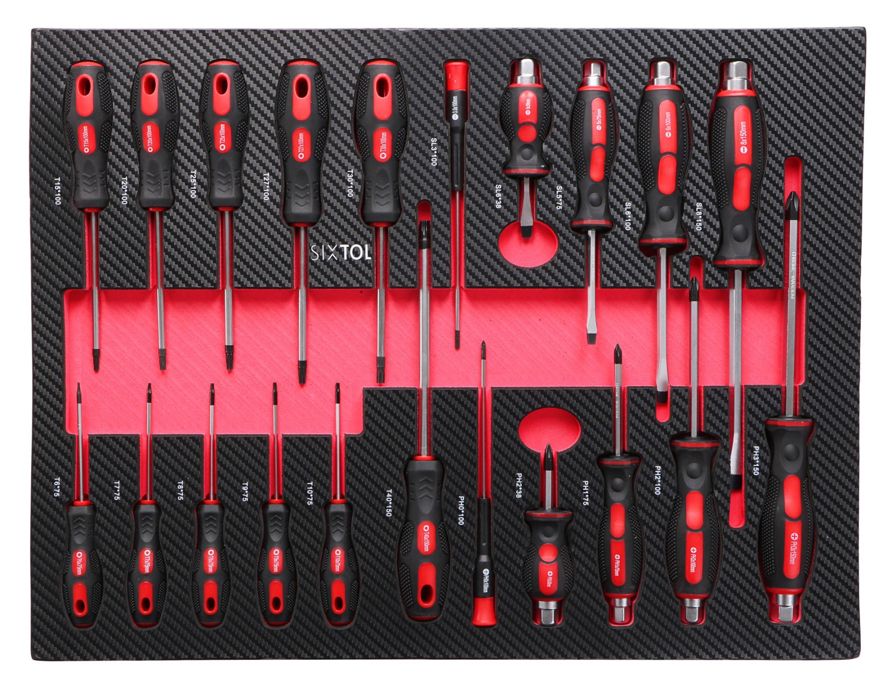- Llaves en T HEX (imbus): H2 × 100 mm; H2.5 × 100 mm; H3 × 100 mm; H4 × 150 mm; H5 × 150 mm; H6 × 150 mm; H7 × 150 mm; H8 × 200 mm; H10 × 200 mm- 7. Cajón – 21x destornilladores (material 40Cr)