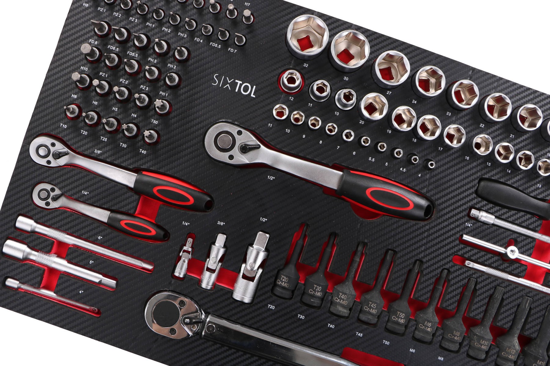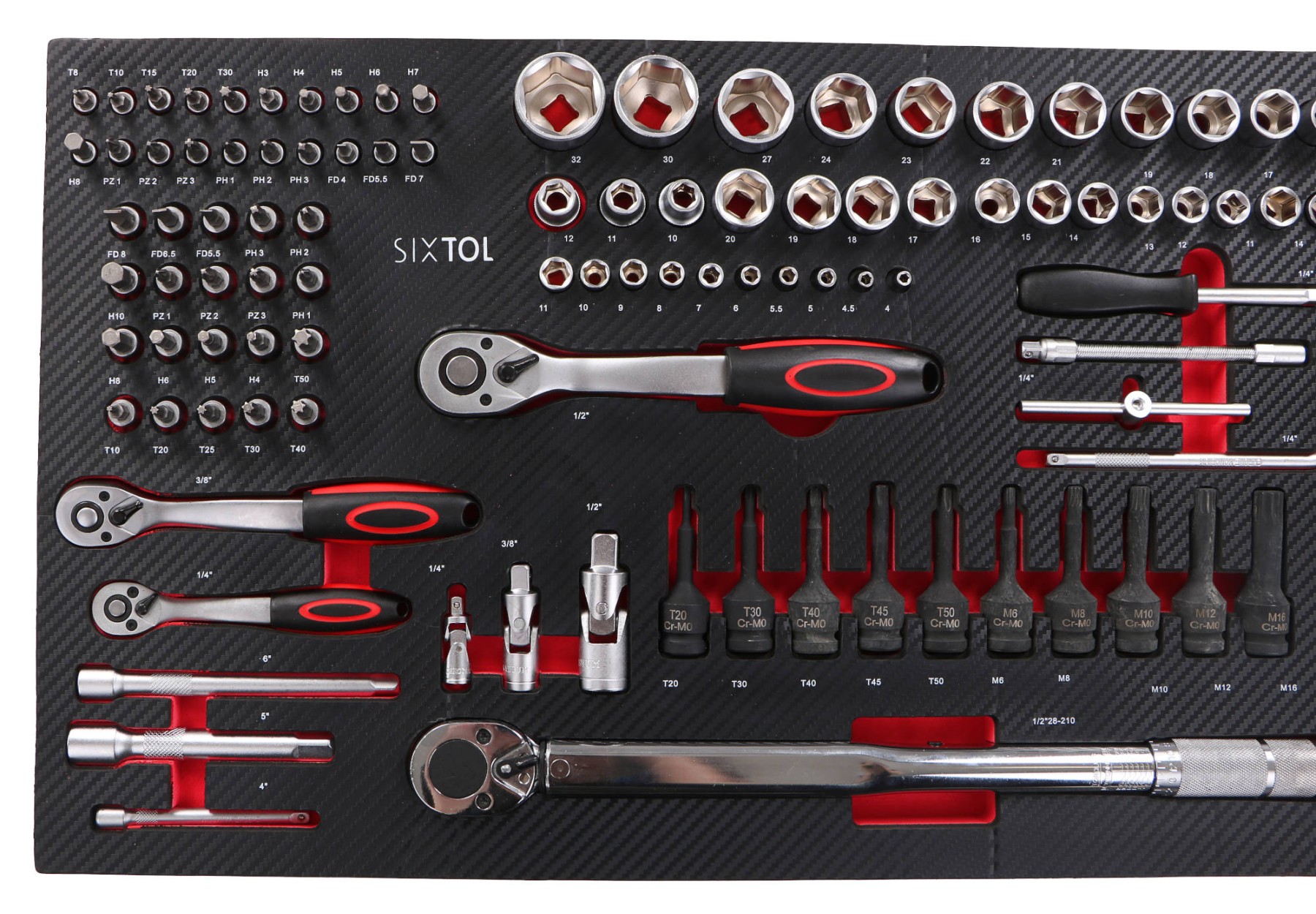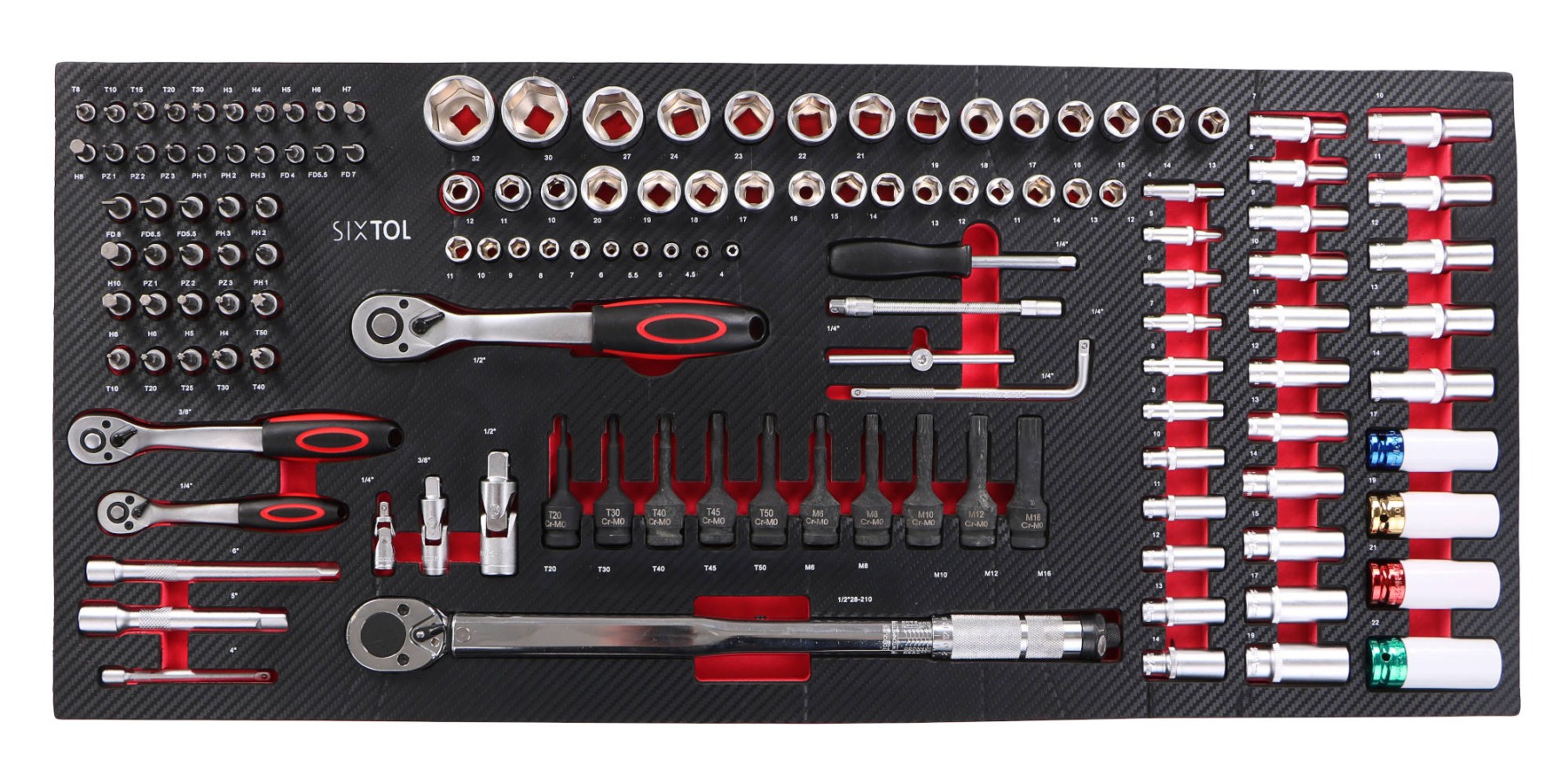 - 3x Otras herramientas 1/4": Mango T deslizante; adaptador flexible; adaptador curvado