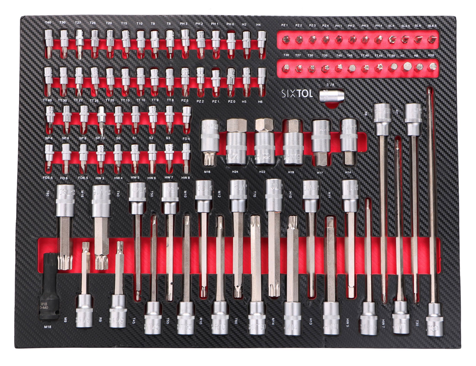 - 18x Llaves combinadas Torx: 6; 7; 8; 9; 10; 11; 12; 13; 14; 15; 16; 17; 18; 19; 20; 21; 22; 24 mm