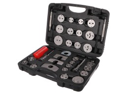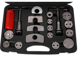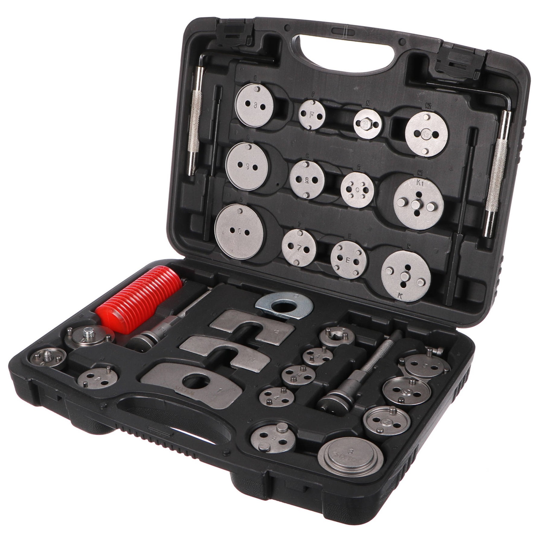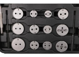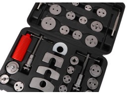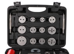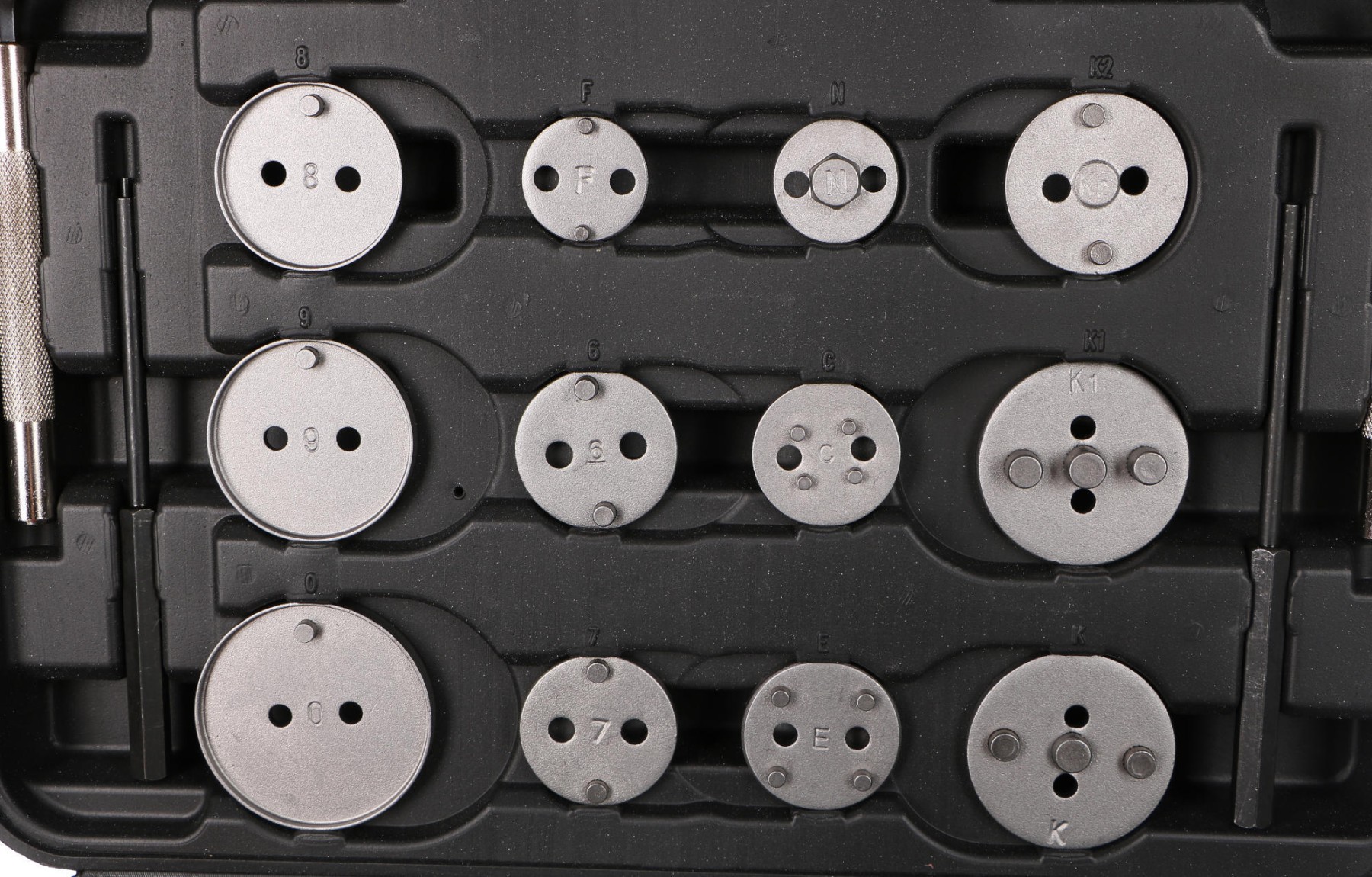 una rosca de compresión de sentido horario y otra antihorario con imán, cuatro topes, dos llaves hexagonales Allen, punzones, envase para lubricante y 24 adaptadores diferentes. En los vehículos con calipers de freno de disco y con unidad de freno de mano integrada, el retroceso de los pistones de freno se realiza mediante giro en sentido inverso; en otros vehículos, mediante el retroceso presionando estos pistones.