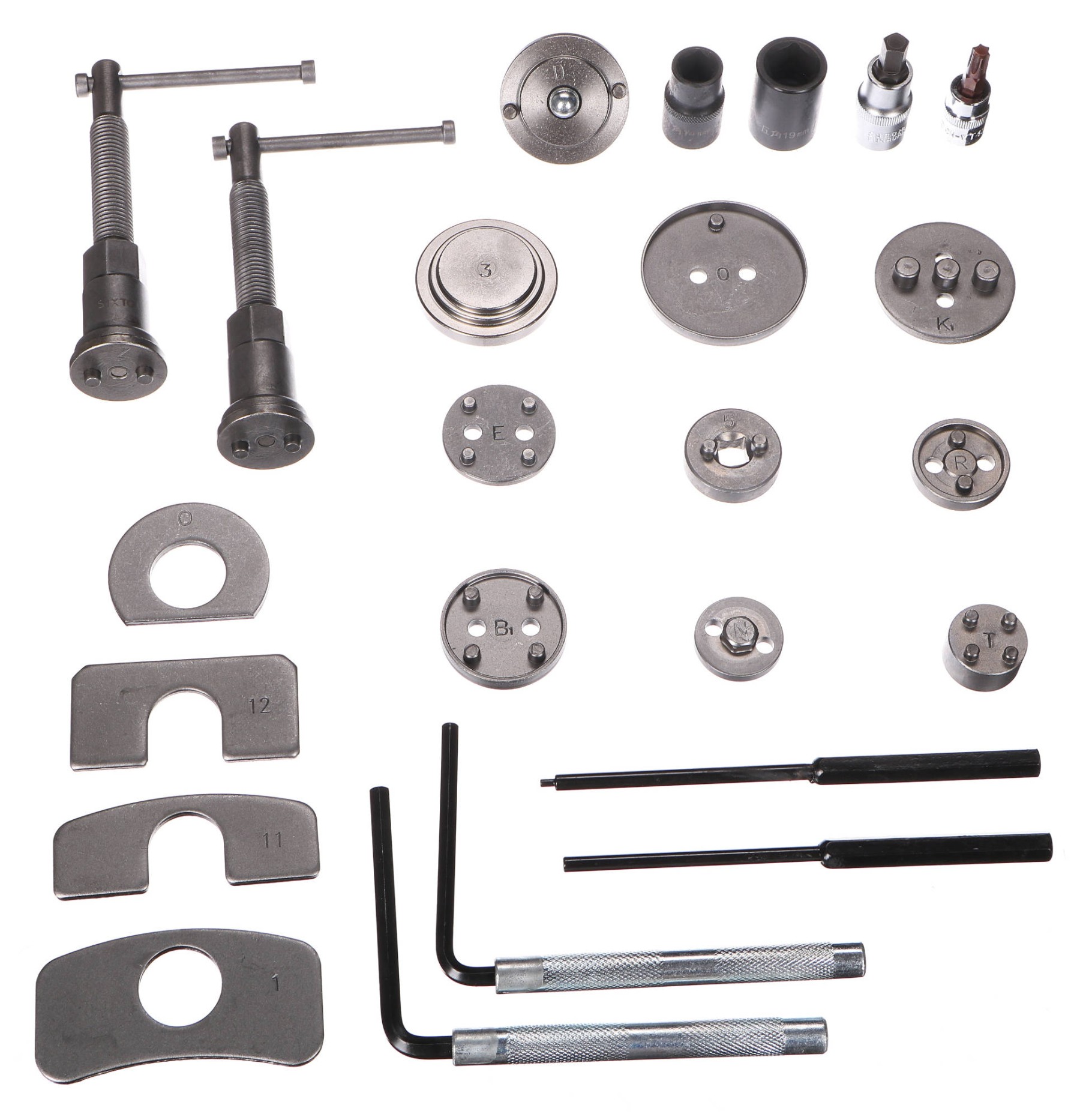incluye un husillo compresor de rosca de sentido horario y otro de sentido antihorario con imán, cuatro topes, dos llaves hexagonales, percutores, un envase para lubricante y una variedad de adaptadores. En vehículos con pinzas de freno y con unidad de freno de mano integrada, el retroceso de los pistones se realiza mediante giro en sentido inverso; en otros vehículos se realiza presionando los pistones hacia atrás.