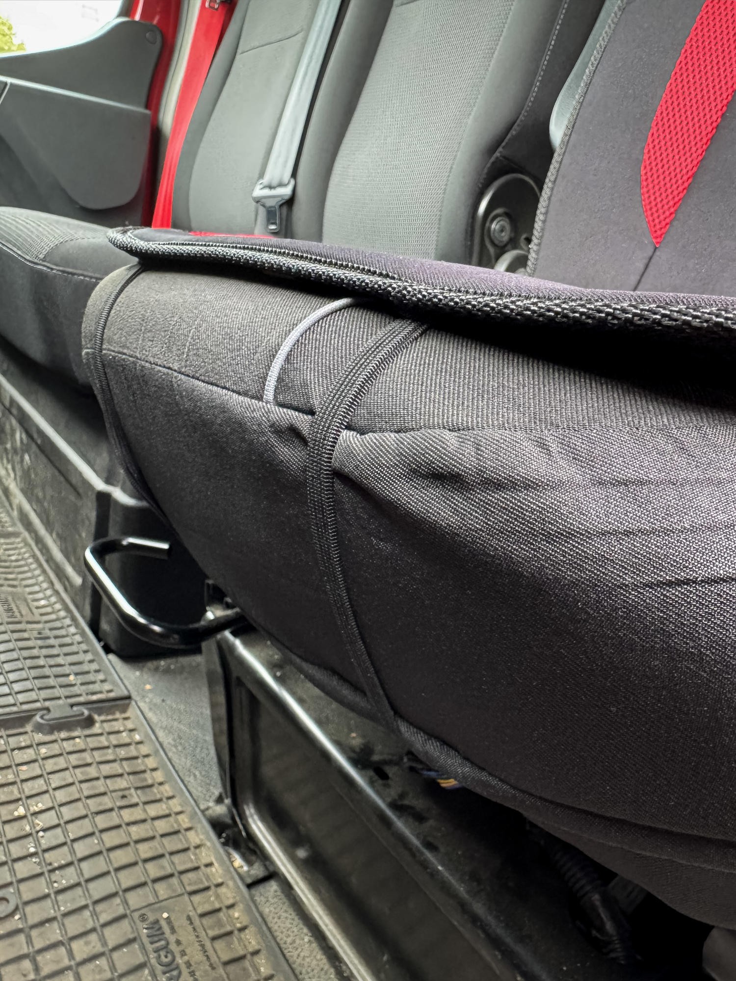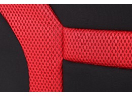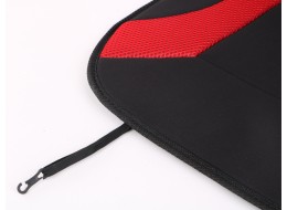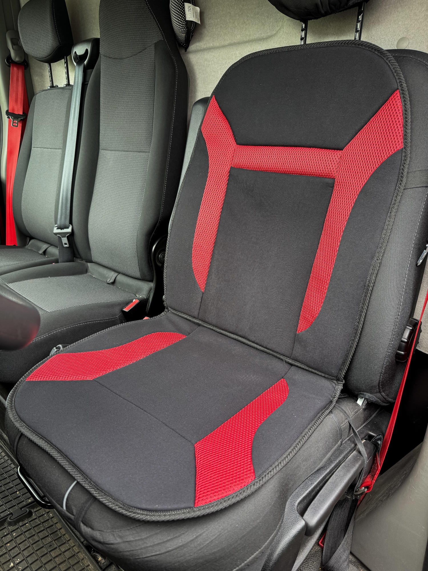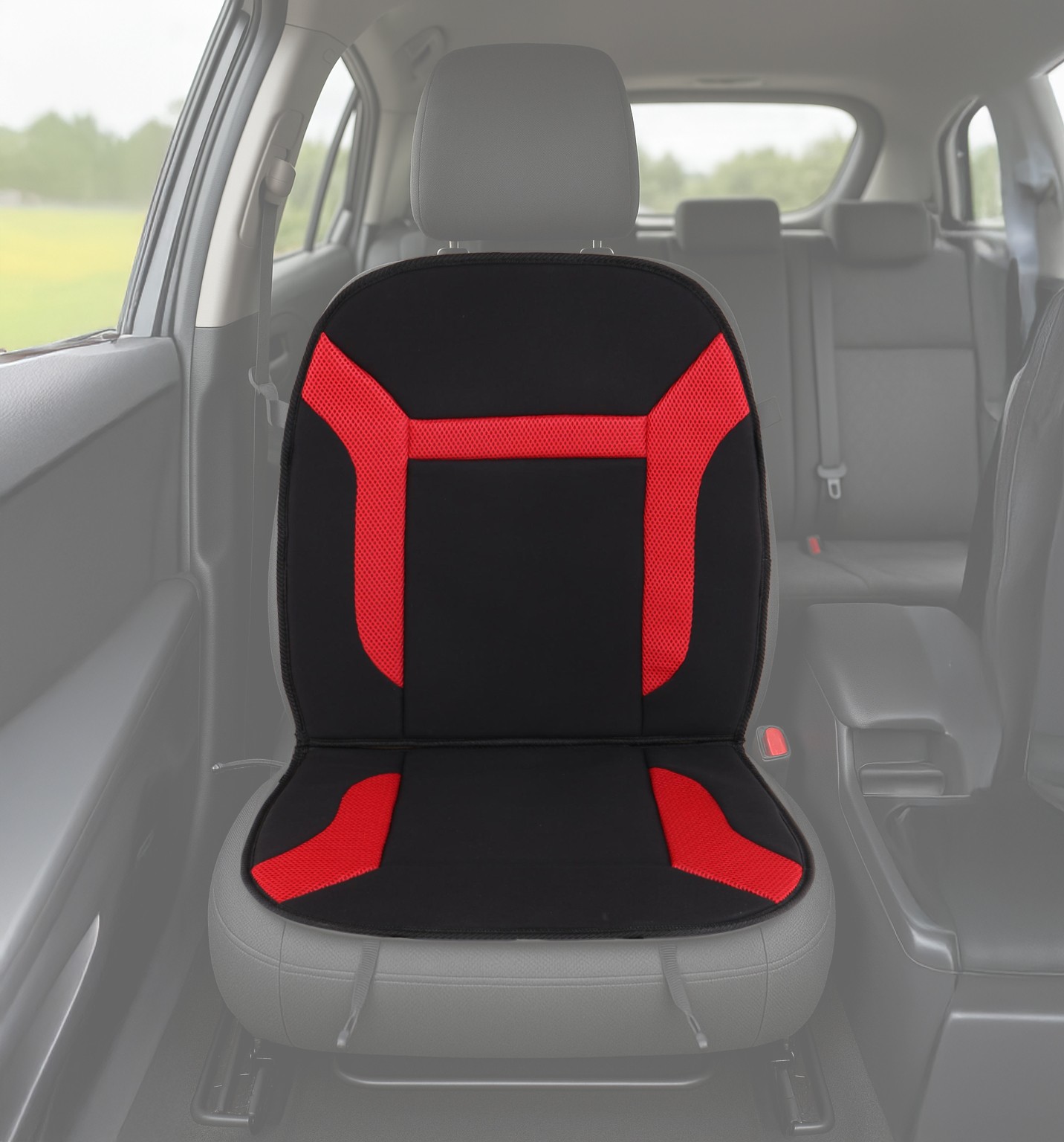 Funda de asiento de coche SIXTOL CAR SEAT COVER PAD 3 La funda de asiento de coche SIXTOL CAR SEAT COVER PAD 3 es un accesorio elegante y práctico para su vehículo que protege la tapicería original del desgaste y aumenta la comodidad al volante. La combinación de negro y rojo con un distintivo diseño deportivo le da al interior un aspecto moderno. La superficie está hecha de una malla agradable y transpirable combinada con un panel textil "sándwich" de colores vibrantes. En el interior hay espuma de 1 cm de grosor con una densidad de 20D, que proporciona un asiento suave. La parte inferior está equipada con una almohadilla de goma antideslizante y tela no tejida negra para una mayor estabilidad. La fijación se realiza mediante correas elásticas y ganchos, lo que permite una rápida instalación y extracción. La funda es compatible con la mayoría de los asientos delanteros.