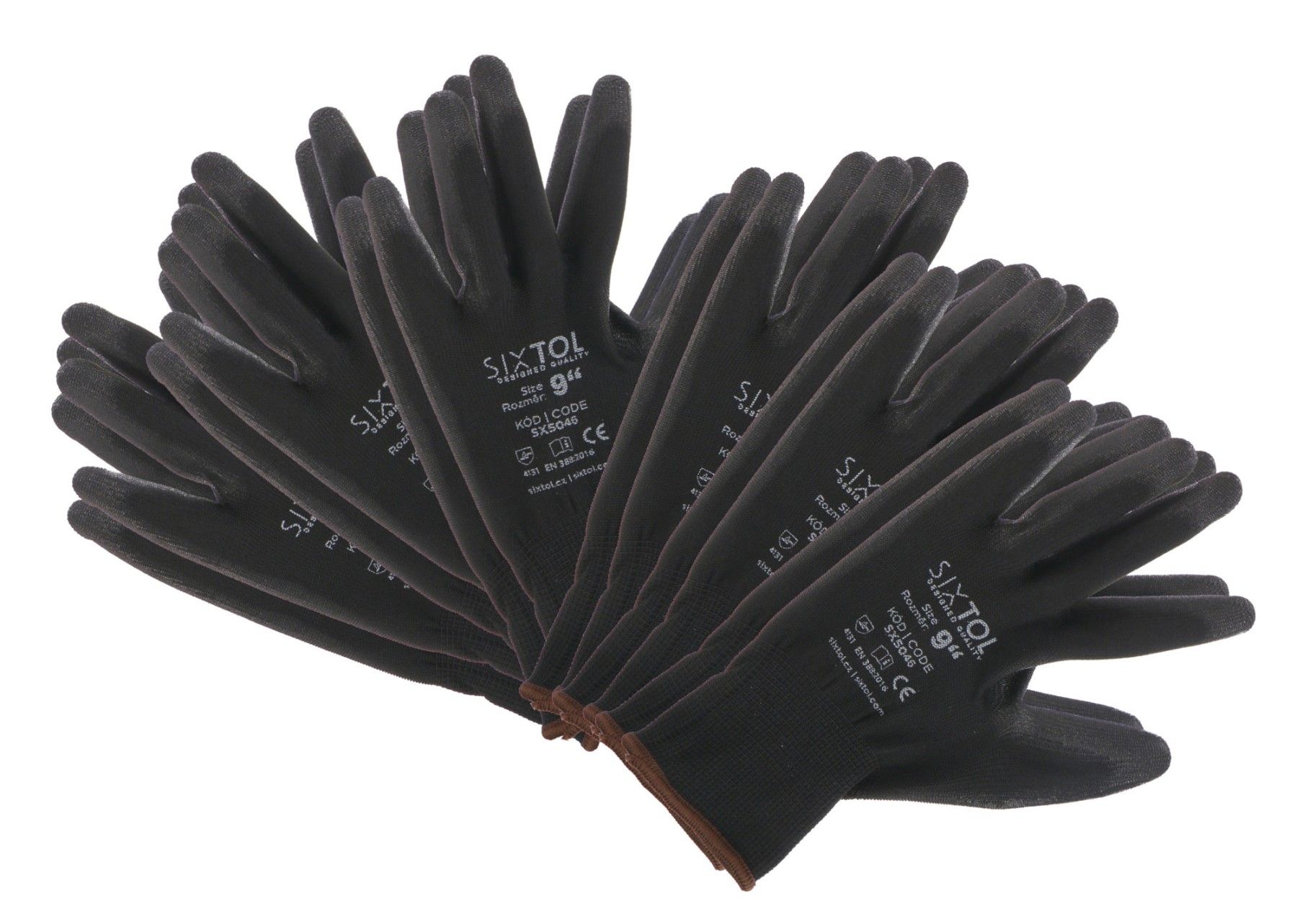 Guantes de trabajo de poliéster parcialmente recubiertos de poliuretano SIXTOL GLOVE PE-PU 9, negros, talla 9", 6 pares SIXTOL