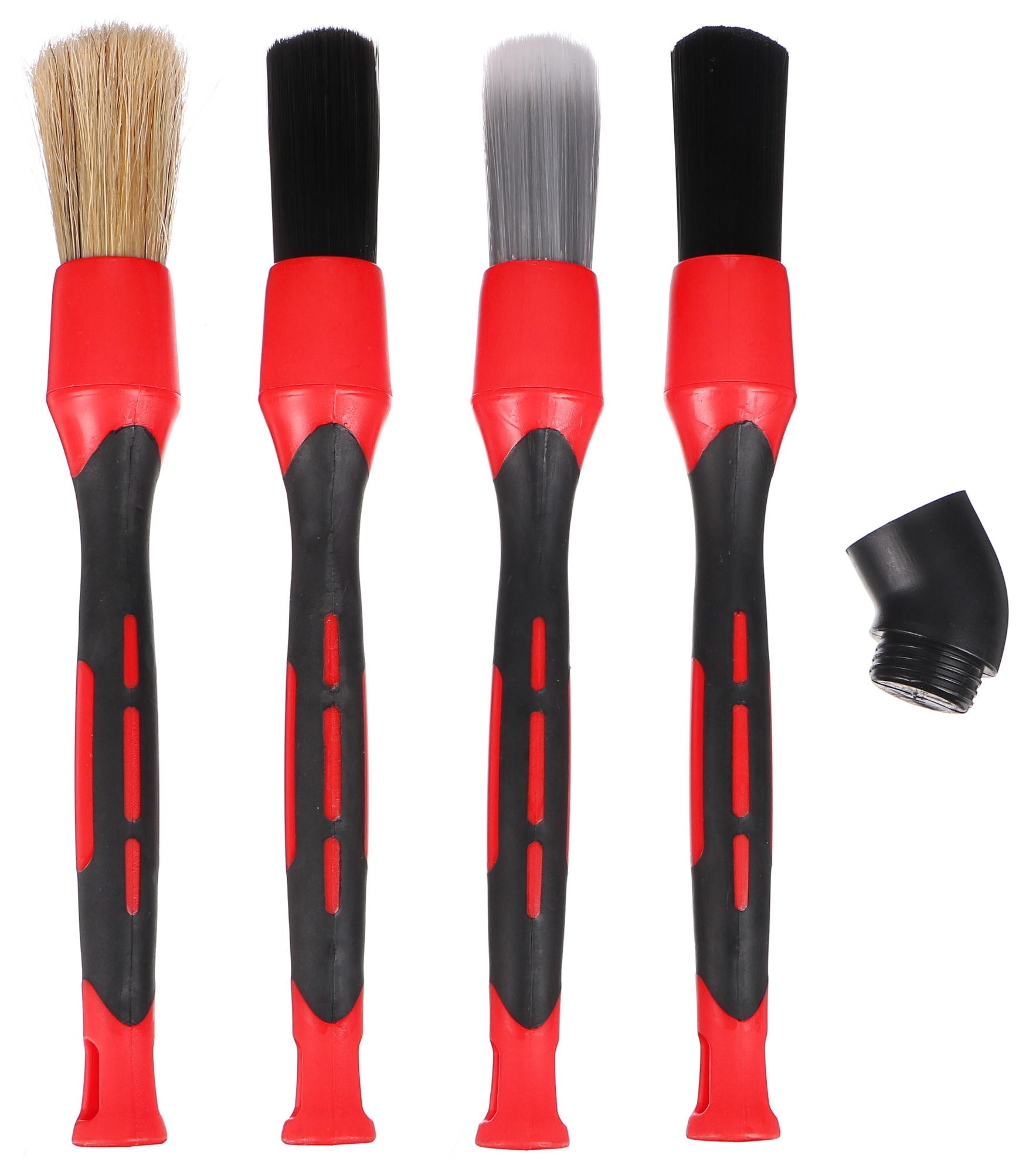 El práctico juego de cepillos de precisión CAR DETAILING BRUSH 4 con cuatro cabezales intercambiables es la opción ideal para una limpieza detallada y eficaz de su vehículo. Contiene 4 cabezales diferentes que permiten una limpieza fácil y profunda, incluso en lugares de difícil acceso, como las rejillas de ventilación, las ranuras entre los asientos o el salpicadero. Cada cepillo tiene cerdas de un material diferente: cerdas de cerdo, polipropileno, seda dura y seda sintética. Las cerdas suaves eliminan suavemente el polvo y la suciedad sin rayar la superficie, y son adecuadas para el interior del vehículo. El juego también incluye un cabezal de 45° para acceder a lugares de difícil alcance. El diseño ergonómico del mango asegura un agarre cómodo. Este juego es una herramienta indispensable para quienes valoran la limpieza y los detalles.