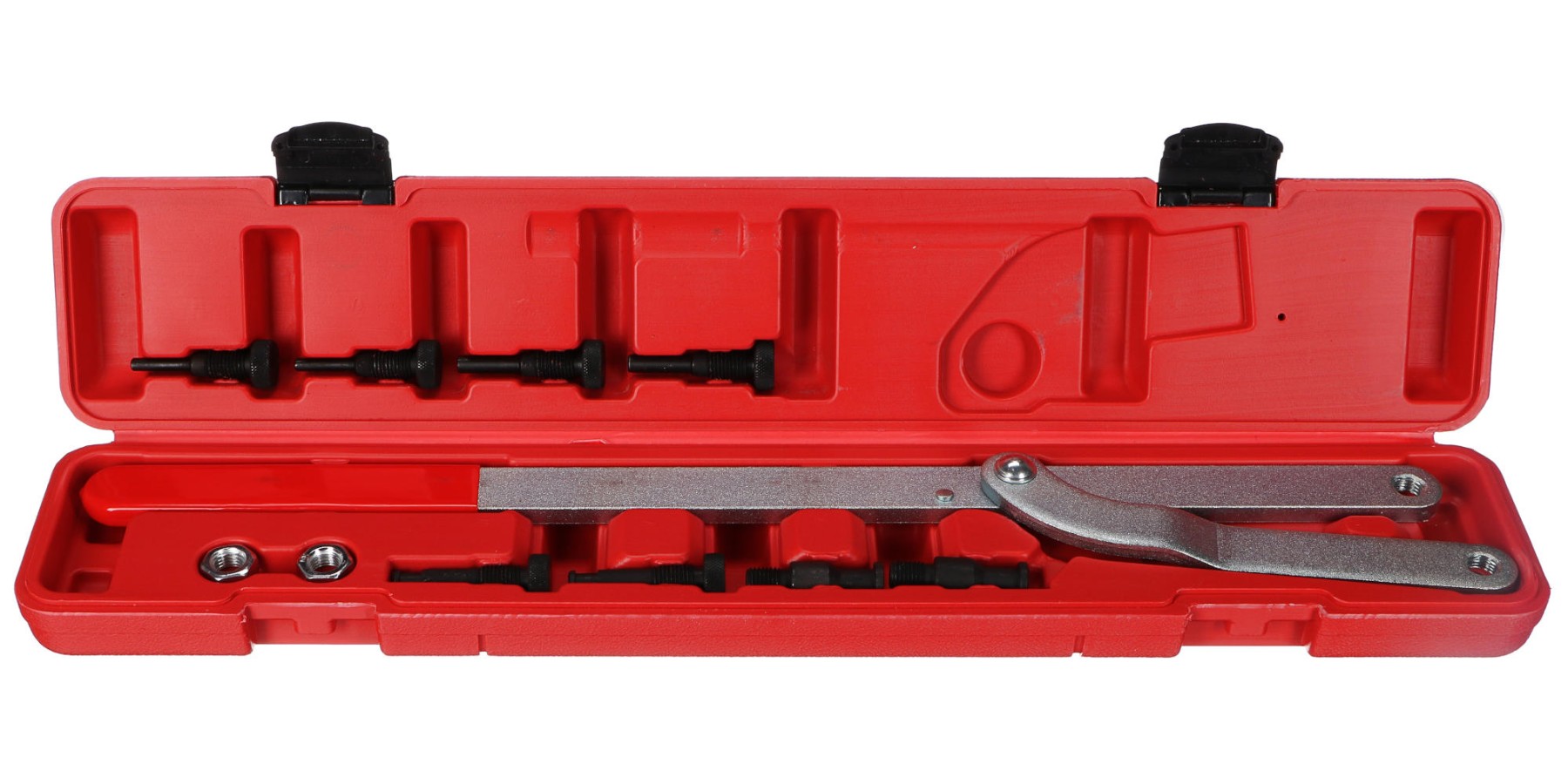 El práctico MECHANIC PULLEY SET 11 es una excelente elección para reparaciones de motores y tensado de correas de polea, adecuado no solo para talleres de automóviles, sino también para garajes domésticos. El set contiene 11 piezas, que cubren todos los diámetros necesarios. La llave está equipada con un mango largo con un mecanismo de tensión para ajustar la tensión de la correa.