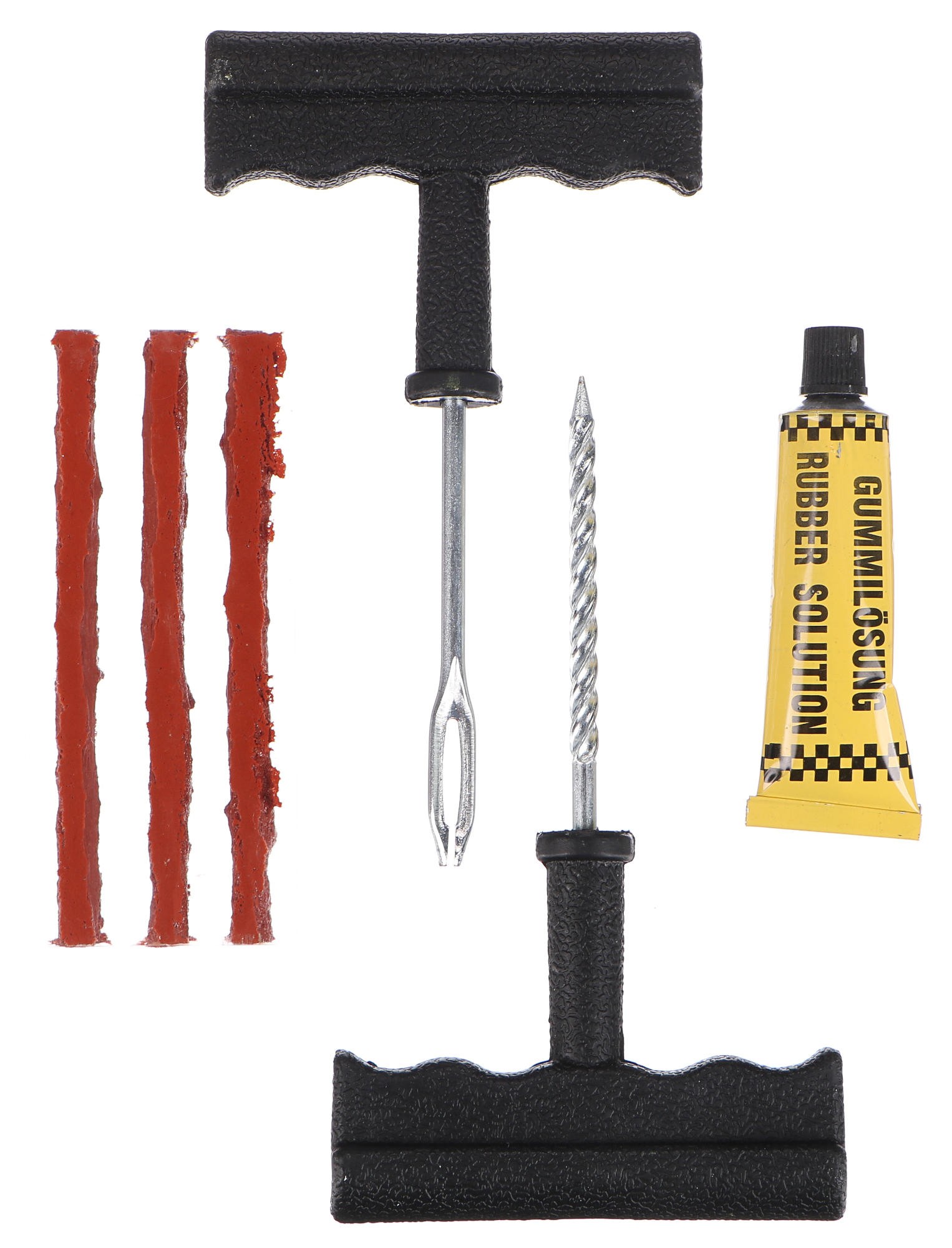 KIT DE REPARACIÓN DE NEUMÁTICOS CAR TIRE REPAIR SET 1 es una herramienta esencial para cada conductor. Le permite reparar rápidamente un pinchazo inesperado sin tener que visitar una estación de servicio, ya sea en un largo viaje, en el trabajo o en casa.Instrucciones de uso: Ubique el pinchazo en el neumático y, si es necesario, retire el objeto que causó el daño. Inserte el escariador en el orificio y muévalo hacia arriba y hacia abajo hasta que pase con facilidad, limpiando y preparando el orificio. Inserte el tapón de goma, del cual se ha quitado la capa protectora, en la herramienta de horquilla y aplique la solución de vulcanización. Coloque la horquilla con el tapón en el orificio de forma que la mitad quede fuera del neumático, luego gire la horquilla y sáquela lentamente. Corte el exceso de tapón lo más cerca posible del neumático.