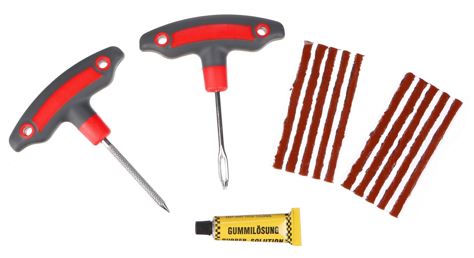kit de reparación de neumáticos CAR TIRE REPAIR SET 3 es una herramienta esencial para cada conductor. Le permite reparar rápida, fácil y temporalmente un pinchazo inesperado sin necesidad de visitar una estación de servicio, ya sea que esté en un viaje largo, en el trabajo o en casa.Instrucciones de uso: Localice el pinchazo en el neumático y, si es necesario, retire el objeto que causó el daño. Inserte el escariador en el orificio y muévalo hacia arriba y hacia abajo hasta que pase con facilidad, limpiando y preparando el orificio. Inserte el tapón de goma, del cual se ha quitado la capa protectora, en la herramienta de horquilla y aplique la solución de vulcanización. Coloque la horquilla con el tapón en el orificio de manera que la mitad quede fuera del neumático, luego gire la horquilla y sáquela lentamente. Corte el exceso de tapón lo más cerca posible del neumático.