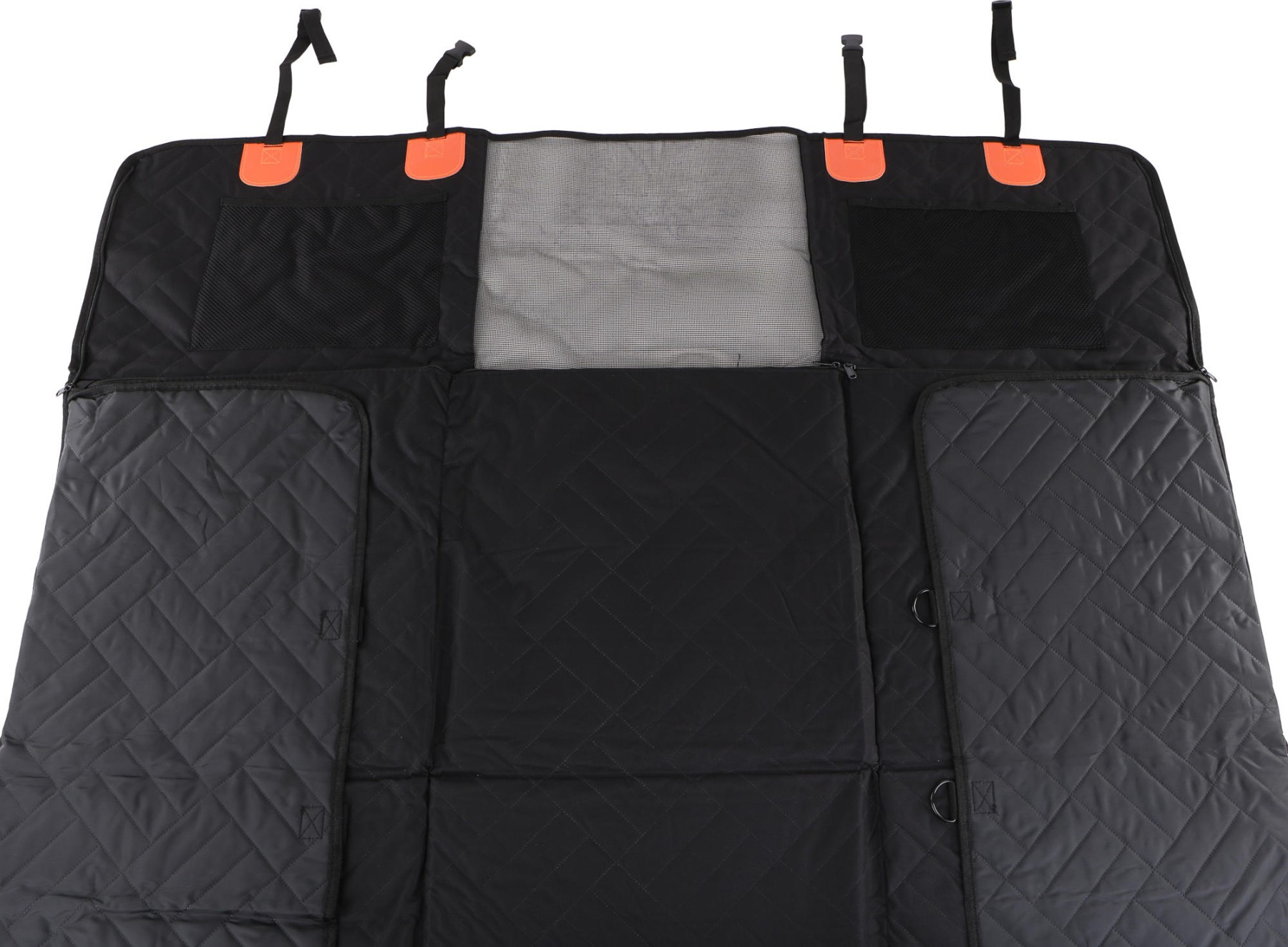 Manta protectora para coche para perro CAR KESSIE SIXTOLLa manta protectora para coche para perro SIXTOL CAR KESSIE está diseñada para el transporte seguro y cómodo del perro en los asientos traseros sin riesgo de ensuciar o dañar el interior del vehículo. El material resistente de tela Oxford 600D impermeable protege eficazmente la tapicería del barro, el pelo, la humedad y los arañazos. Gracias a su área prolongada, la manta cubre no solo los asientos sino también la zona junto a las puertas, facilitando la entrada y salida del perro. Las correas de sujeción prácticas aseguran un anclaje estable a los reposacabezas y evitan que la manta se desplace durante la conducción. La estructura incluye también partes de malla para una mejor ventilación y contacto visual con el perro.