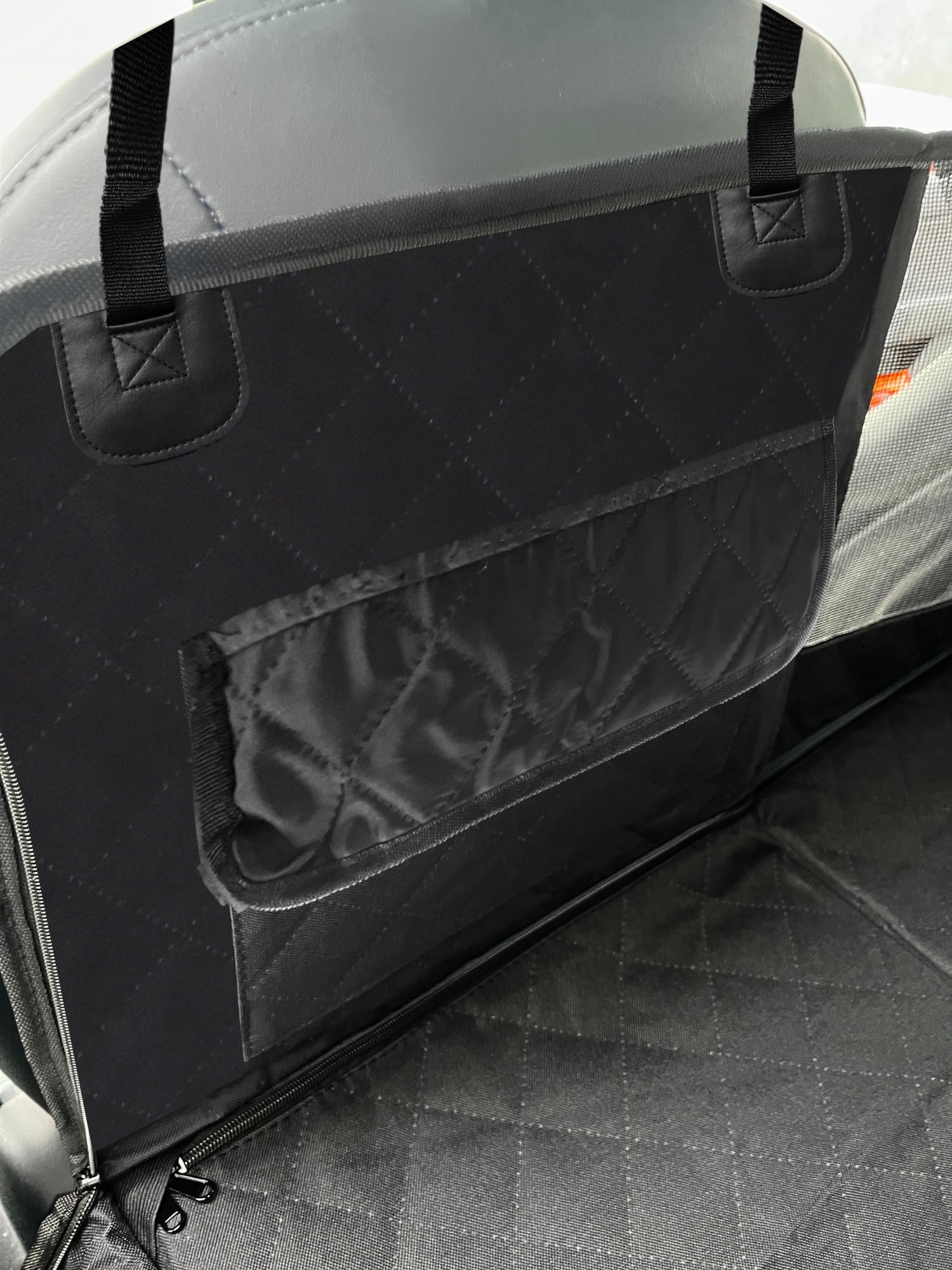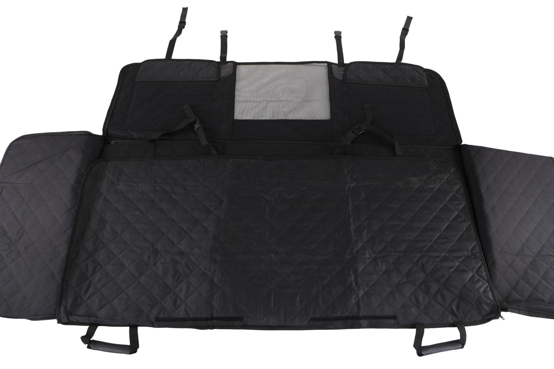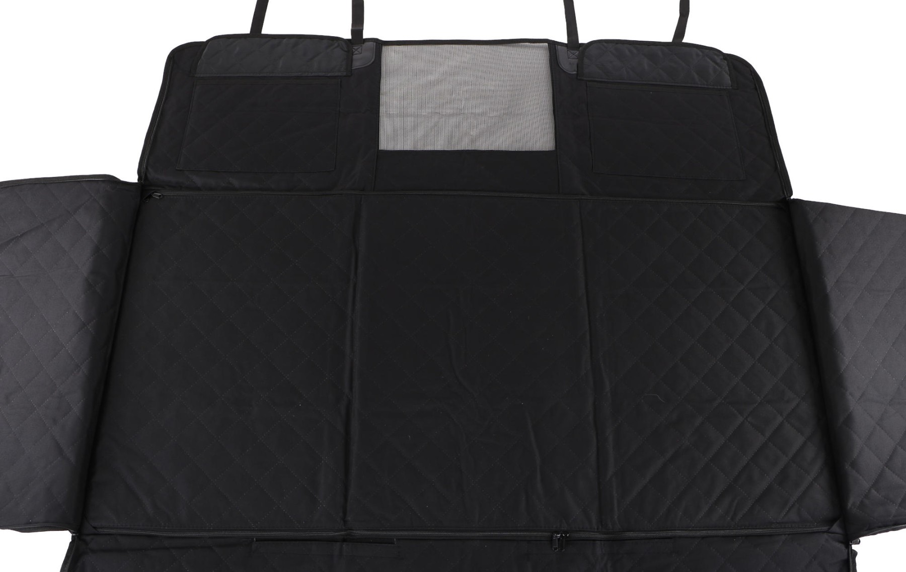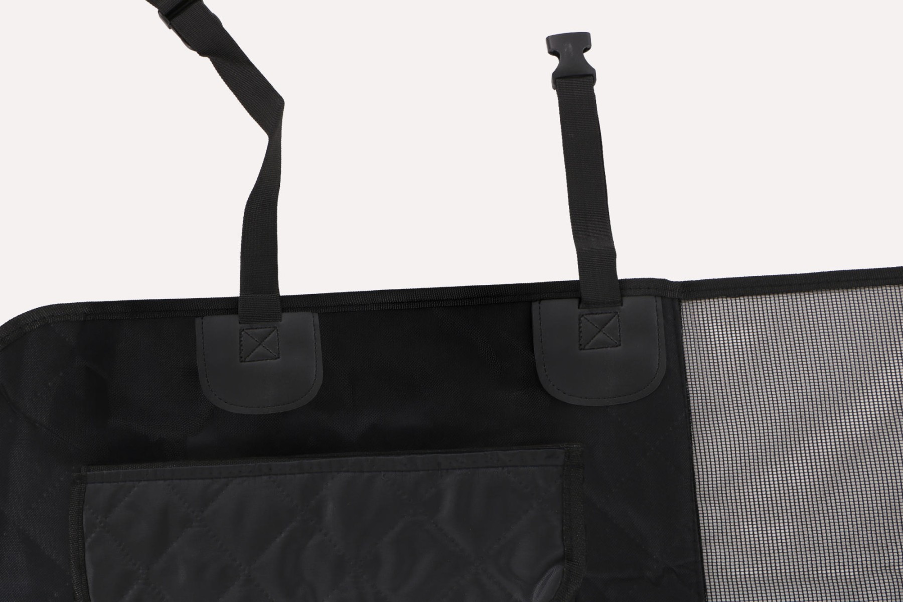 La funda protectora para coche SIXTOL CAR BRUNO está diseñada para proteger los asientos traseros durante el transporte de perros y ayuda a mantener el interior del vehículo limpio e intacto. La funda tiene una construcción acolchada y está fabricada con una tela resistente e impermeable que protege la tapicería contra agua, barro, pelos y el desgaste mecánico. Gracias a un sistema de correas ajustables con mosquetones, se fija fácilmente a los reposacabezas y se mantiene estable incluso durante la conducción. Los laterales de la funda proporcionan protección adicional a los costados de los asientos al entrar y salir el perro y, además, pueden levantarse y fijarse con una cremallera en cada lado para evitar que la mascota se escape cuando las puertas están abiertas. Incluye una sección de malla que permite una mejor circulación del aire y el contacto visual con el perro durante el viaje. La funda es adecuada no solo para transportar perros, sino también para proteger el interior al trasladar diversos objetos.